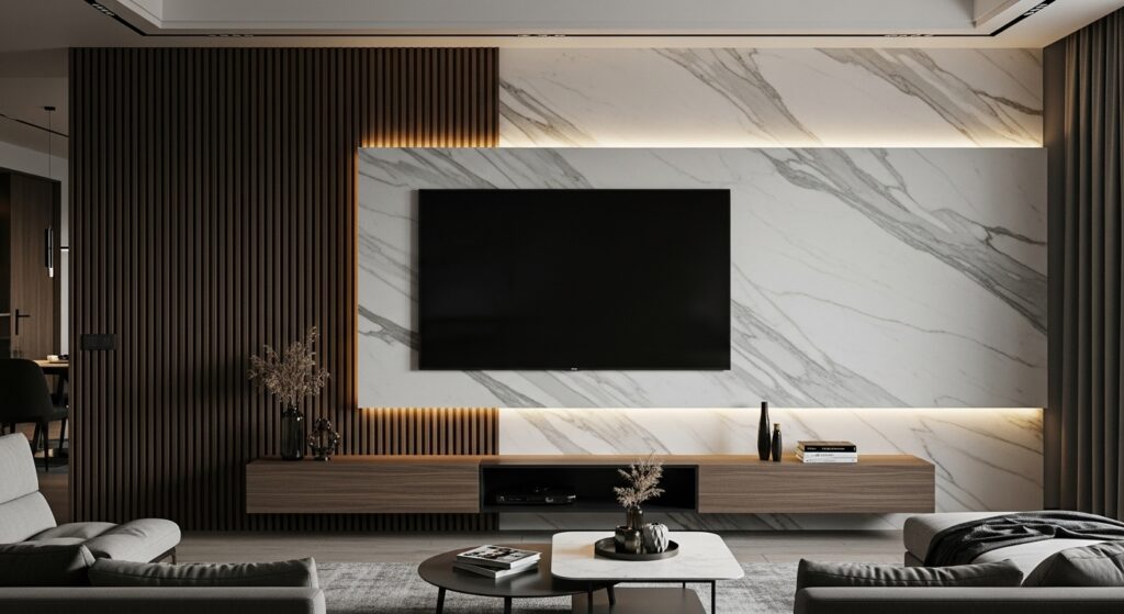 • Concealment: A well-designed feature wall design can hide unsightly bomb shelter doors or fuse the entrance to a hallway into the wall itself (the “hidden door” concept), making the living area feel significantly longer and more continuous.