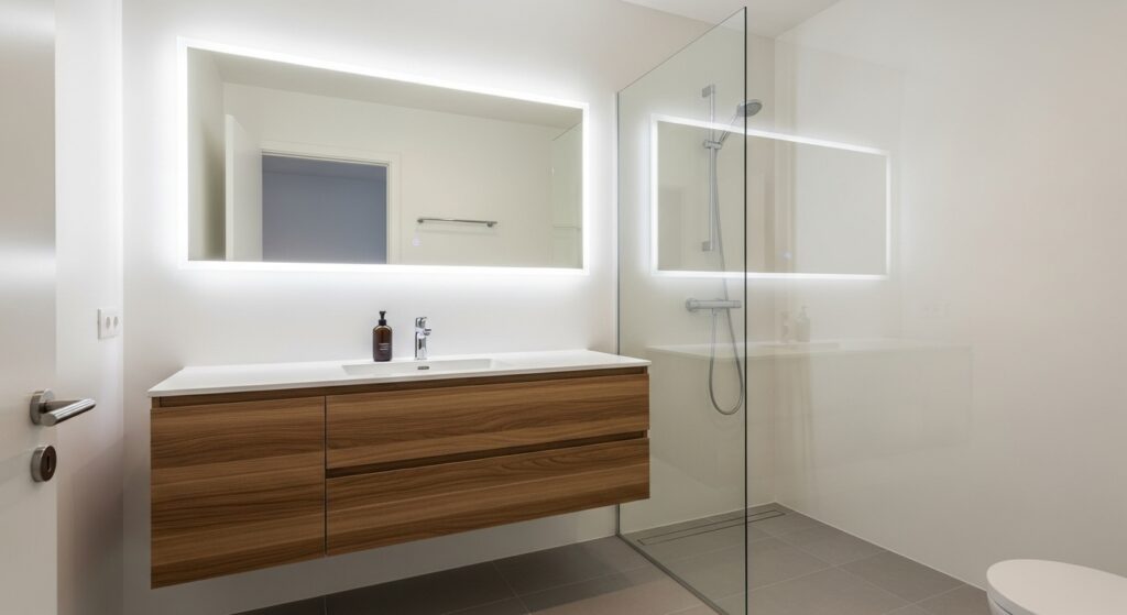 • Vanity Design: A floating vanity (wall-hung) makes the bathroom floor easy to clean and makes the tight space look bigger.